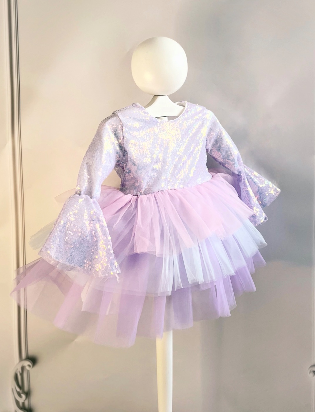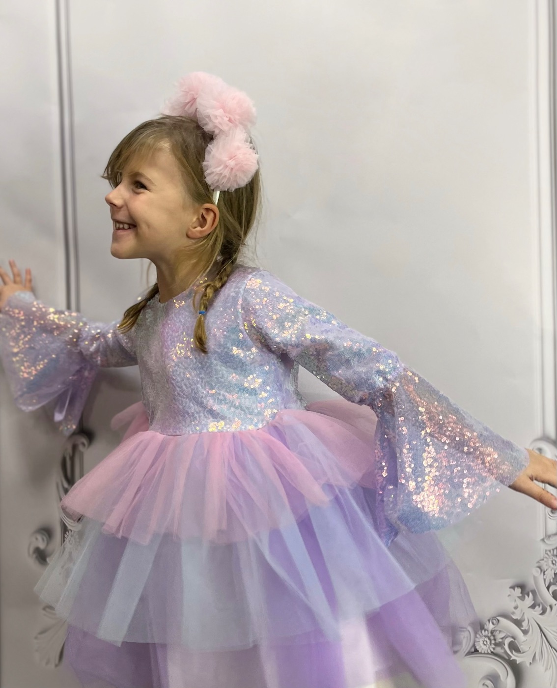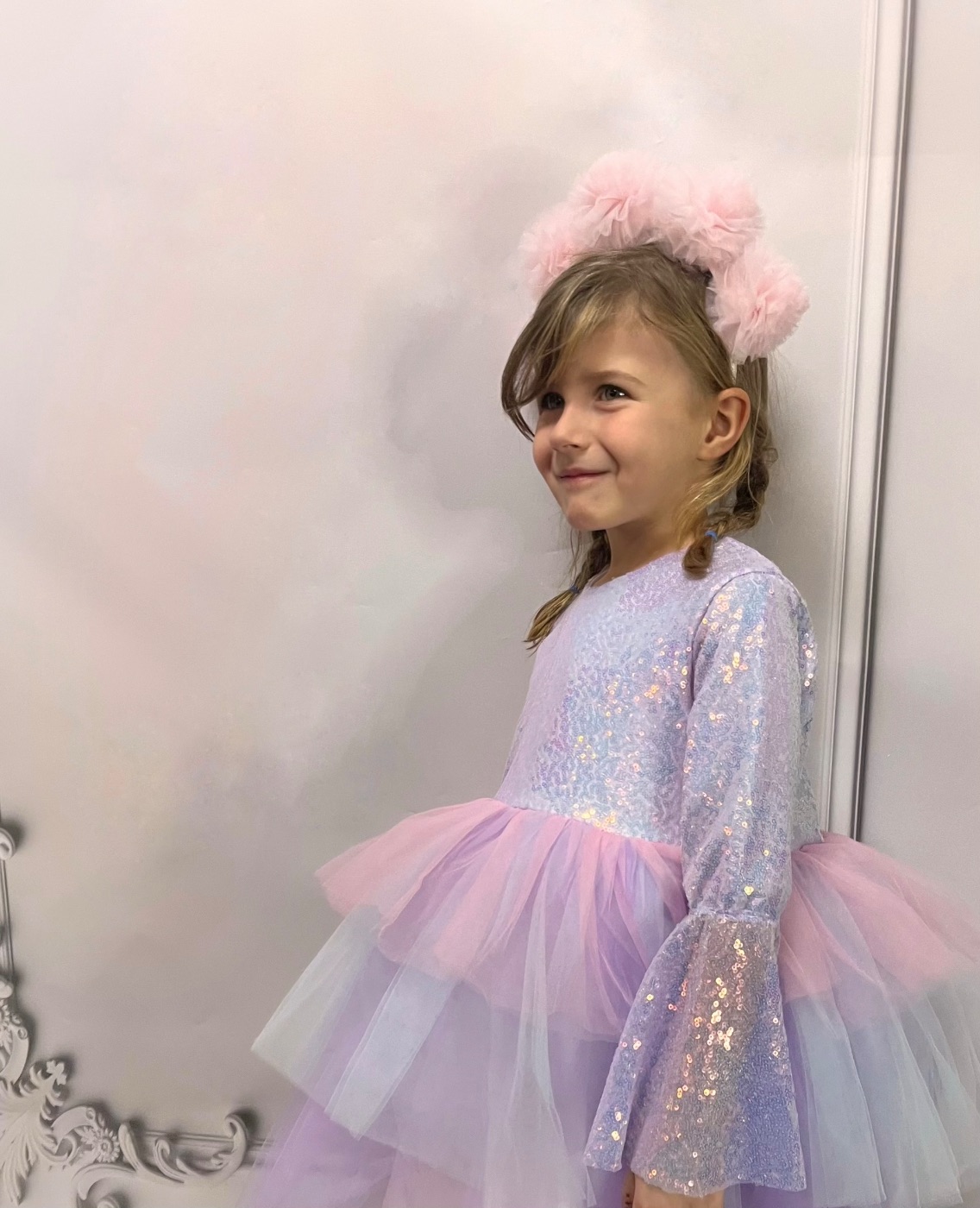 Haljina “Ametist” očarava svojom prelepom kombinacijom nežnih ljubičastih tonova i svetlucavih detalja. Gornji deo prekriven diskretnim šljokicama blista pri svakom pokretu, dok raskošni zvonasti rukavi dodaju dašak elegancije. Slojevita til suknja u prelivima pastelnih nijansi stvara bajkoviti efekat, čineći ovu haljinu savršenim izborom za sve male princeze koje vole magiju i sjaj.