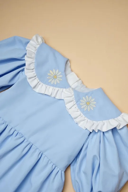 Nježna i razigrana plava haljinica sa puf rukavima i detaljima u vidu belih volana i izvezenih cvetića na okovratniku. Lepršav kroj pruža udobnost, dok bajkoviti detalji dodaju poseban šarm. Savršena za rođendane, fotografisanja i sve posebne prilike.