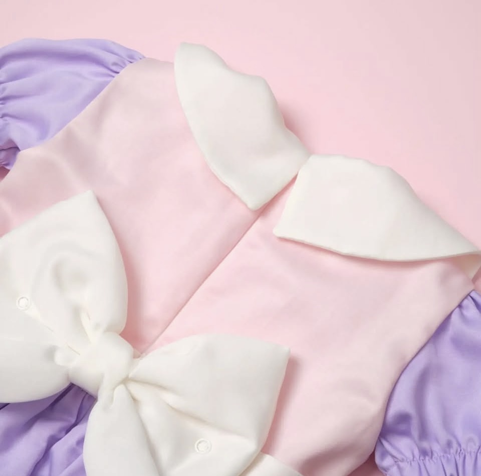 Predivna haljinica u kombinaciji pastelno roze i nežno ljubičaste boje koja odiše nežnošću i elegancijom. Beli kragnici i puf rukavi daju joj poseban šarm, dok raskošna suknjica omogućava udobnost i slobodu pokreta. Idealna za rođendane, proslave i svečane trenutke.